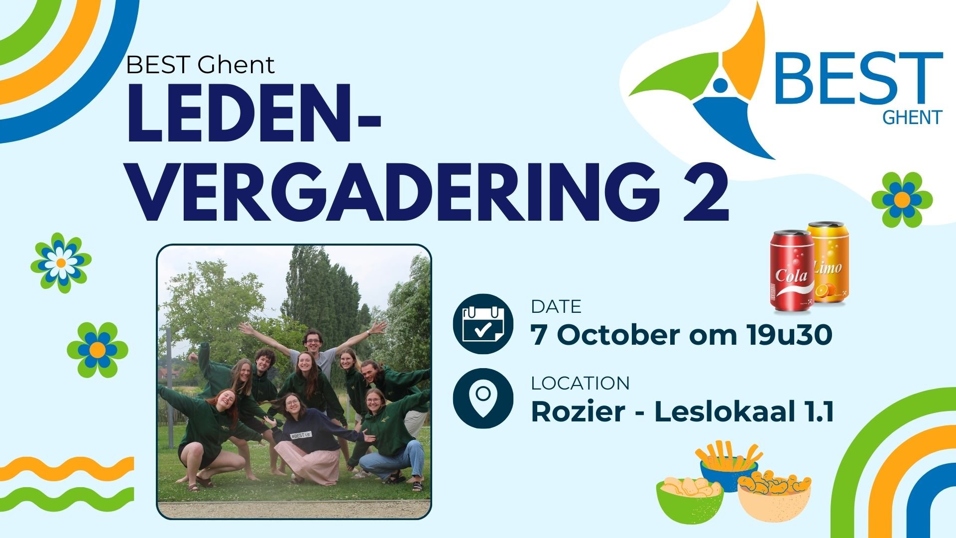 Dit is de 2e ledenvergadering van BEST, deze vindt plaats in leslokaal 1.1 in het Roziergebouw, om 19u30. Iedereen is zeker welkom, ook als je nog niets van BEST afweet! Mocht je met vragen zitten, contacteer ons dan zeker (best@vtk.ugent.be).