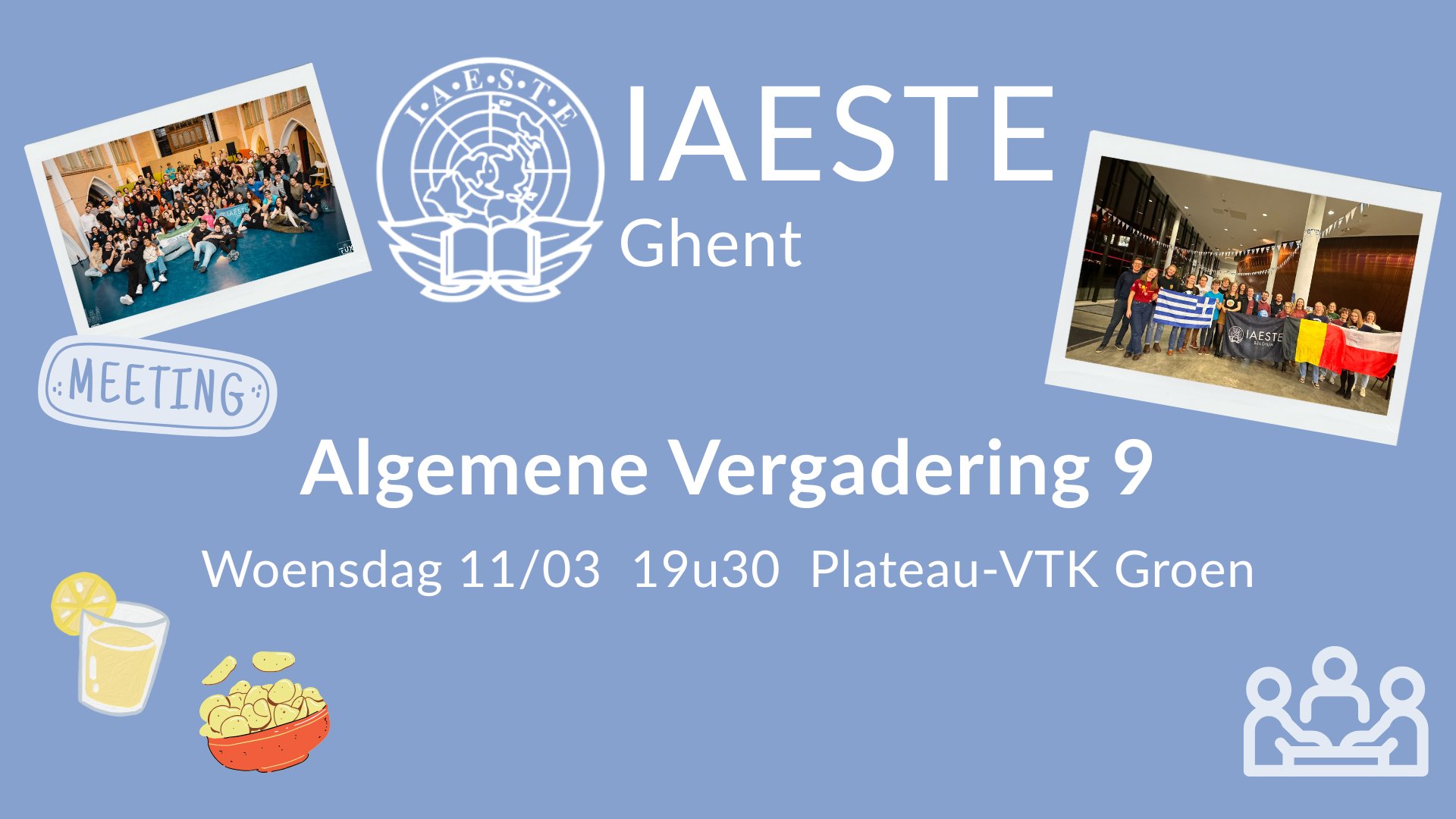 Allen aanschouw! De negende vergadering van IAESTE! Deze vindt plaats in studentenlokaal VTK Groen op 11 maart om 19u30.