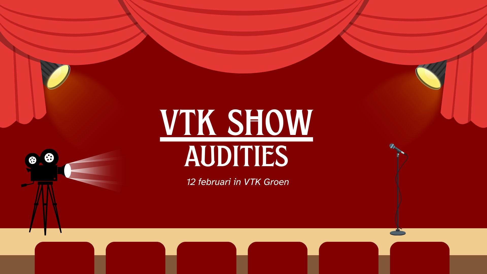 Kom dan zeker auditie doen voor de VTK-Show! We zullen te vinden zijn vanaf 17u tot 22u in VTK Groen. We zullen zelf een kleine tekst voorzien die jullie mogen opvoeren. Geen stress, je hoeft zeker geen ervaring te hebben, tot dan!